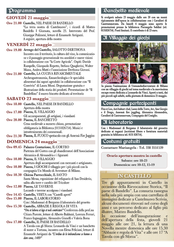 Da lunedì 4 maggio saranno aperte le iscrizioni presso la Biblioteca (tel. 0131826754) per il banchetto medievale. Pubblichiamo qui l'anteprima del programma completo della rievocazione di maggio.